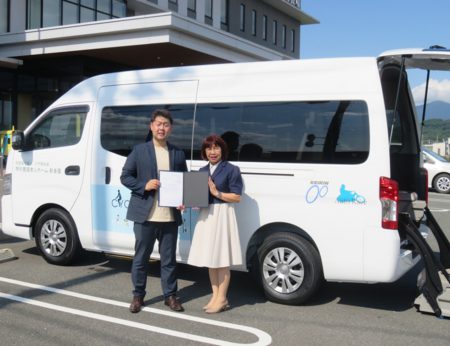井上町長に福祉車両の整備を報告しました JKA様の「2025年度オートレース公益資金による補助事業」による助成を受け福祉車両を整備したことを報告しました。新たな福祉車両は、車いすが4台搭載できることから利用者様の病院受診やレクレーションの外出支援がこれまで以上に期待でき、また、災害等の緊急時において車いすでの避難が必要な方への支援にも協力したいと申し出をしました。